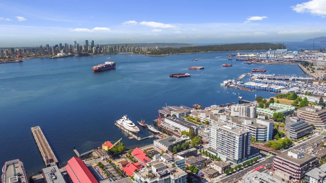 Welcome to The Landing at the Pier – a boutique concrete residence in the heart of Lower Lonsdale. This expansive 1,378 sq.ft. 2 bedroom, 3 bathroom city home offers rare flexibility with zoning that allows for both residential and live/work commercial use. Impressively large room sizes, including 2 oversized bedrooms (both w/ ensuite bathrooms) & flexible family room/office at the entry, boasting immaculate engineered hardwood floors throughout. The south-facing exposure w/ peek-a-boo harbour views brings in natural light, while modern comforts like AIR CONDITIONING & a gas range elevate the everyday. Offering a rooftop patio & 1 secured parking stall. Live the Lolo lifestyle, steps to the Shipyards, restaurants, Quay market, Seabus & transit. Easy to show!
