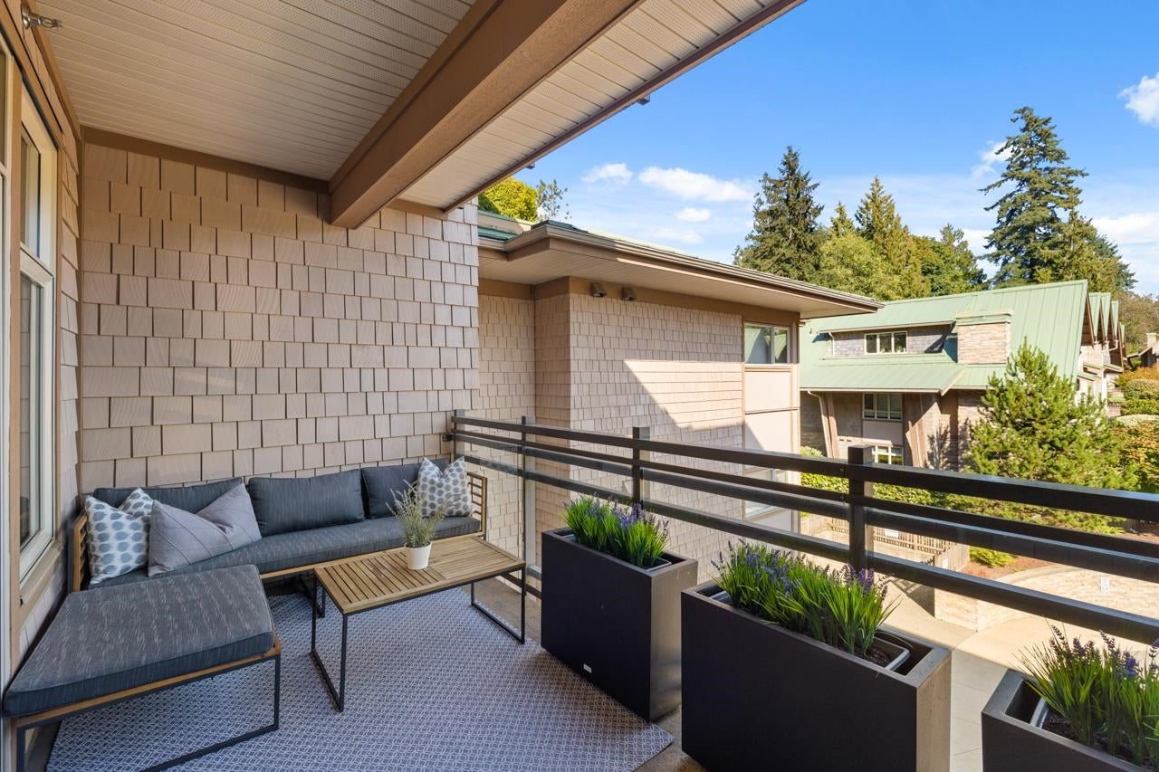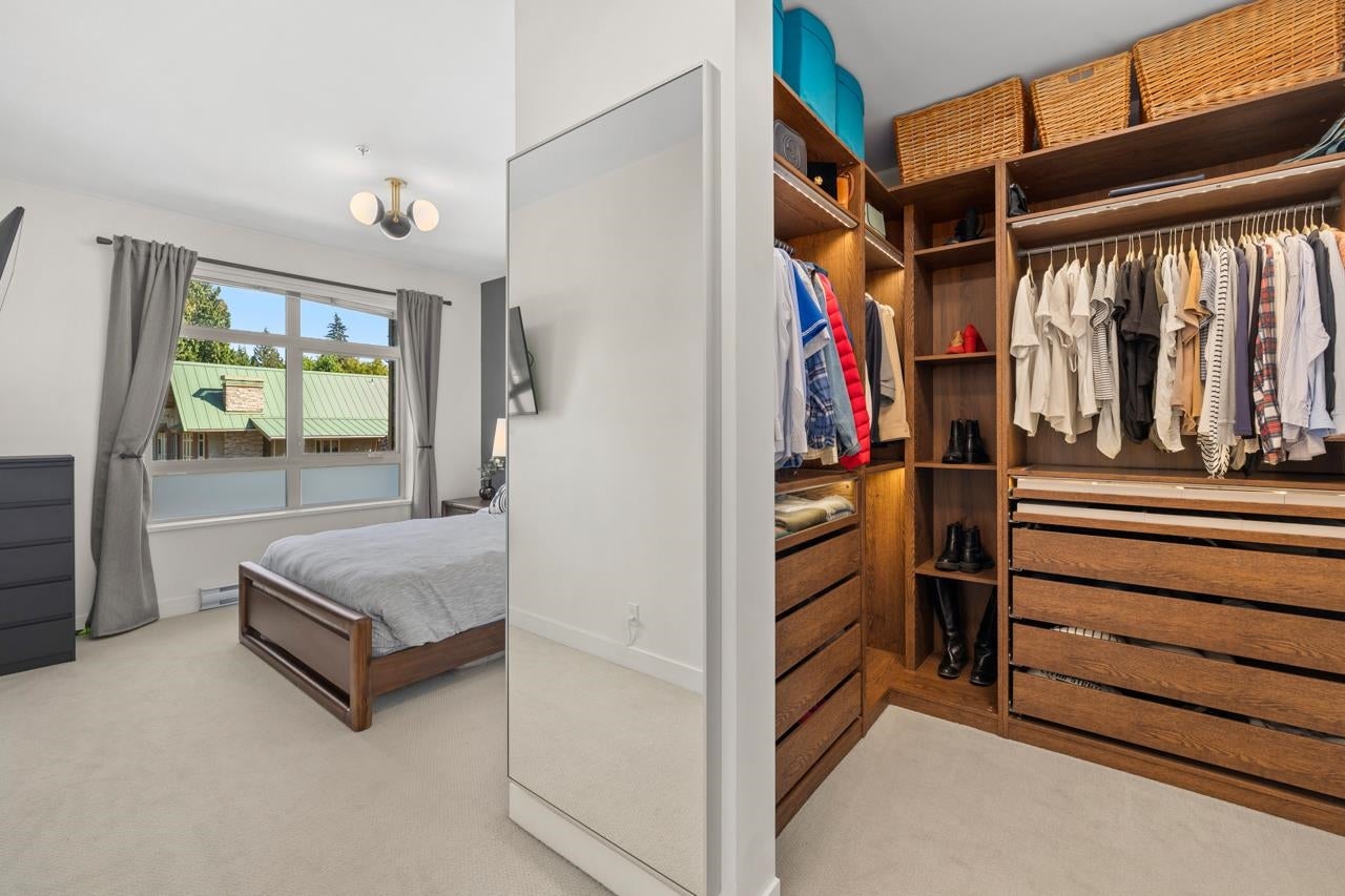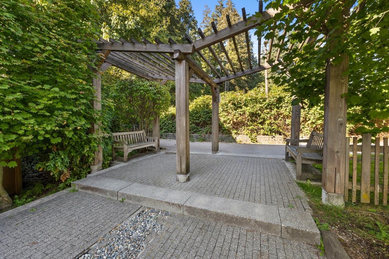 This stylish 2-bedroom + den home offers 1,095 sq ft of refined living space w/ 9-ft ceilings & a modern open-concept layout, perfect for entertaining. Enjoy high-end stainless steel appliances, quartz countertops & custom fir shelving. Relax in the sun on the oversized covered patio. The spacious primary bedroom features a custom walk-through closet leading to a generous ensuite. The office nook is ideal for those that work from home & need dedicated workspace but don't want to sacrifice the 2nd bedroom. Nestled in a Whistler-inspired complex that backs onto forest trails bordering the Northlands Golf Course, just minutes from the Deep Cove and Parkgate Shopping Centre. 2 parking stalls w/ EV charging, a storage locker, guest suite & gym. Open Saturday September 27 1-2:30pm