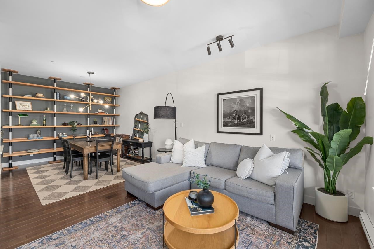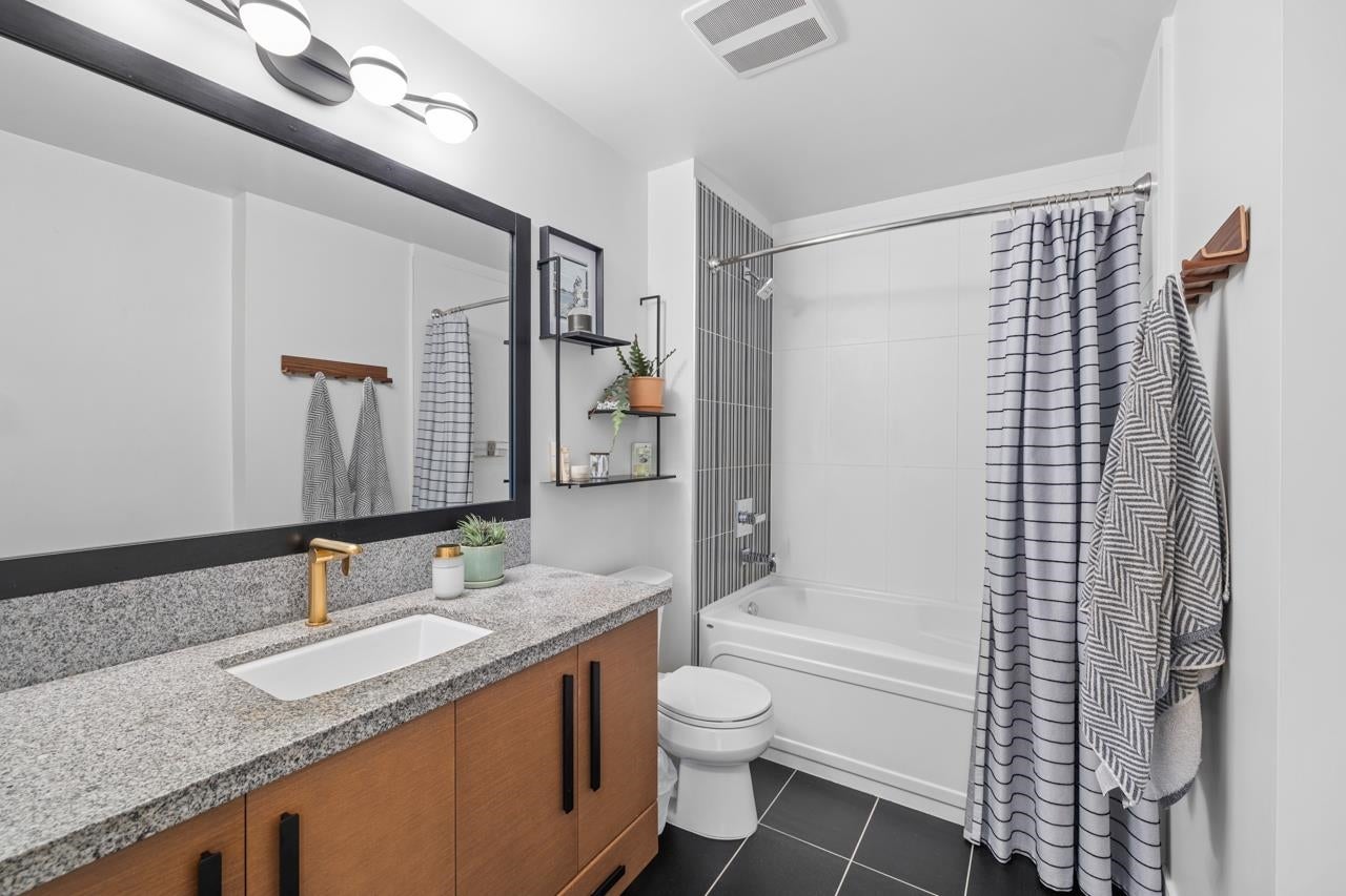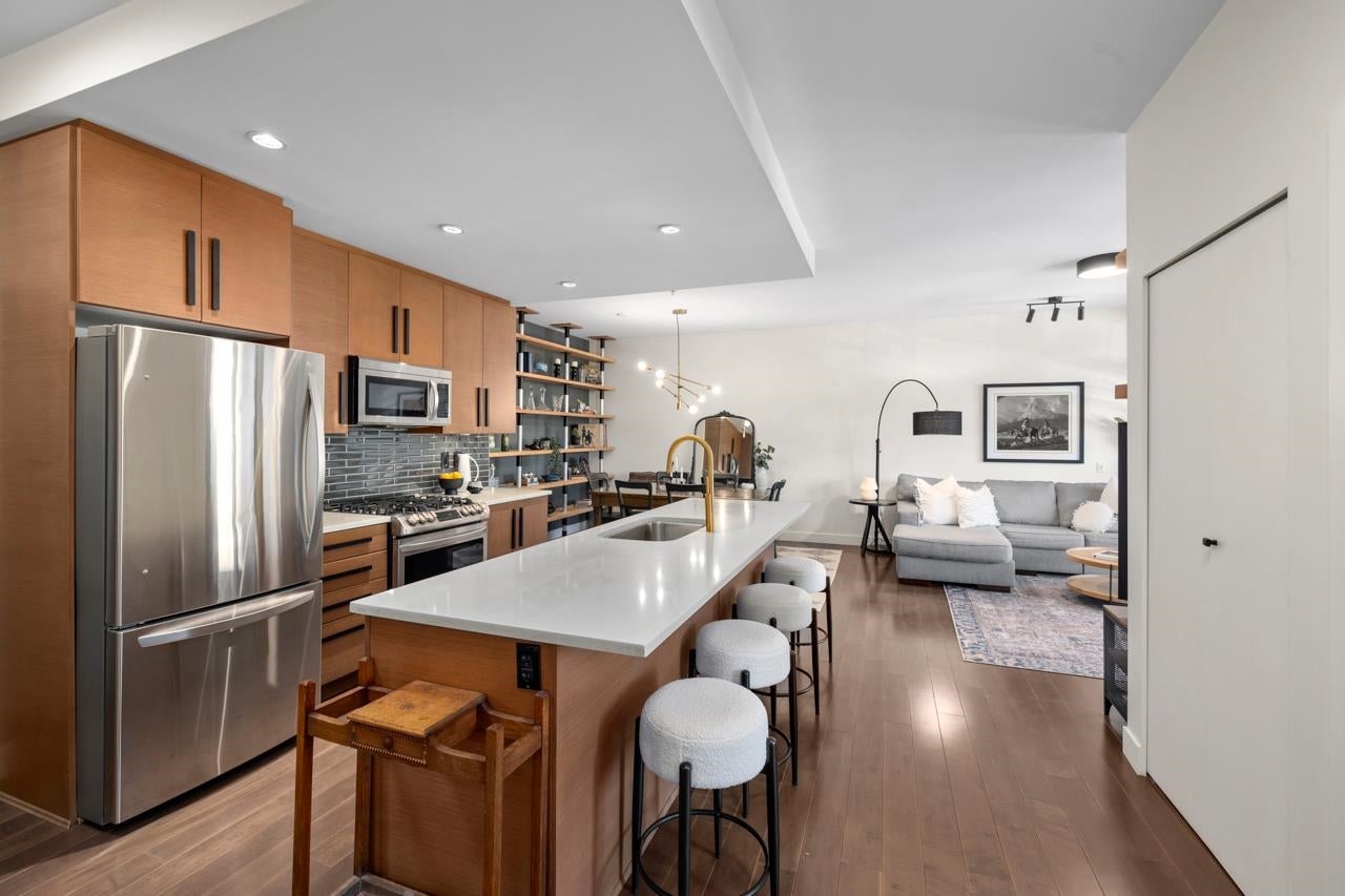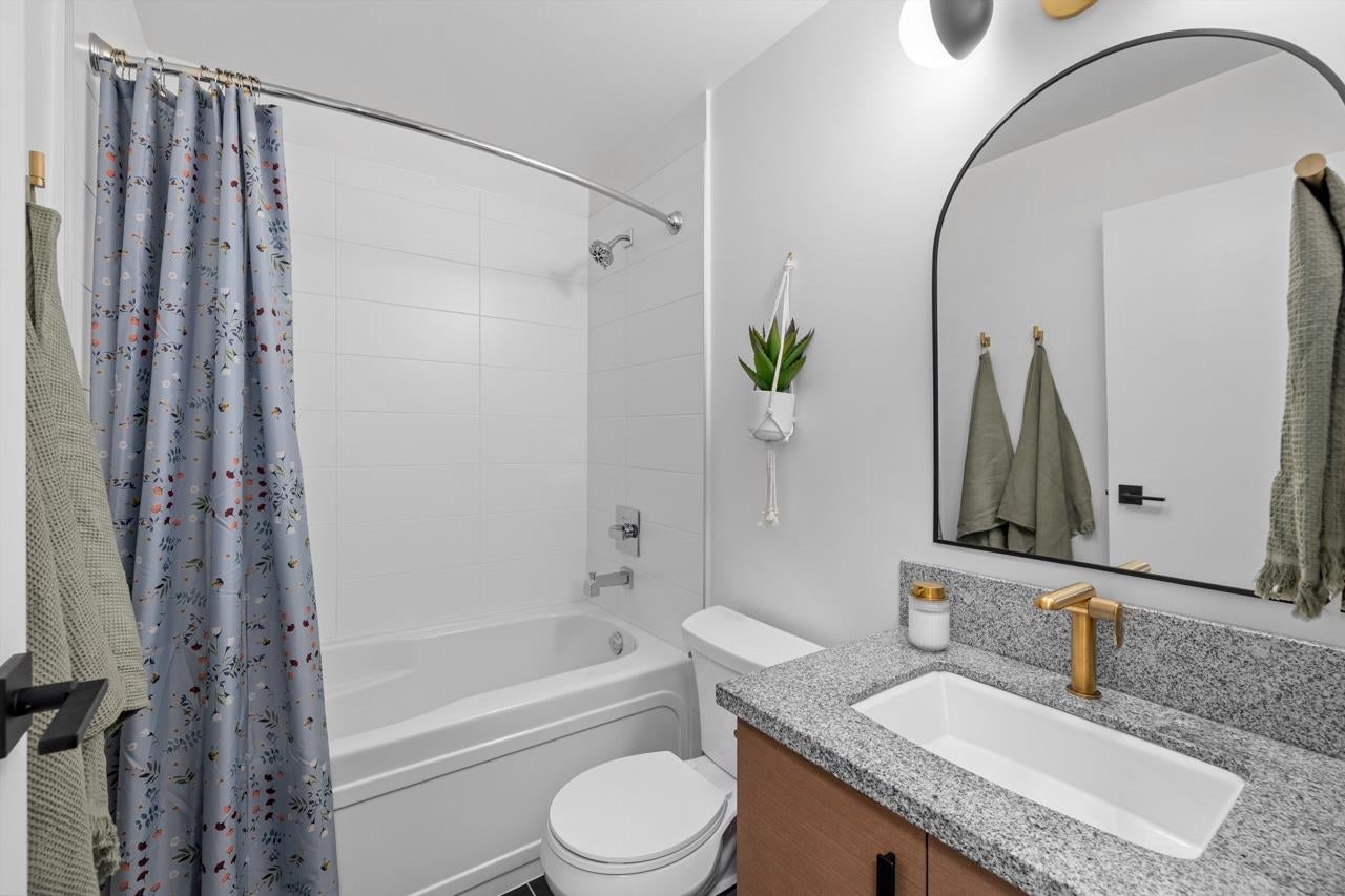 This stylish 2-bedroom + den home offers 1,095 sq ft of refined living space w/ 9-ft ceilings & a modern open-concept layout, perfect for entertaining. Enjoy high-end stainless steel appliances, quartz countertops & custom fir shelving. Relax in the sun on the oversized covered patio. The spacious primary bedroom features a custom walk-through closet leading to a generous ensuite. The office nook is ideal for those that work from home & need dedicated workspace but don't want to sacrifice the 2nd bedroom. Nestled in a Whistler-inspired complex that backs onto forest trails bordering the Northlands Golf Course, just minutes from the Deep Cove and Parkgate Shopping Centre. 2 parking stalls w/ EV charging, a storage locker, guest suite & gym. Open Saturday September 27 1-2:30pm